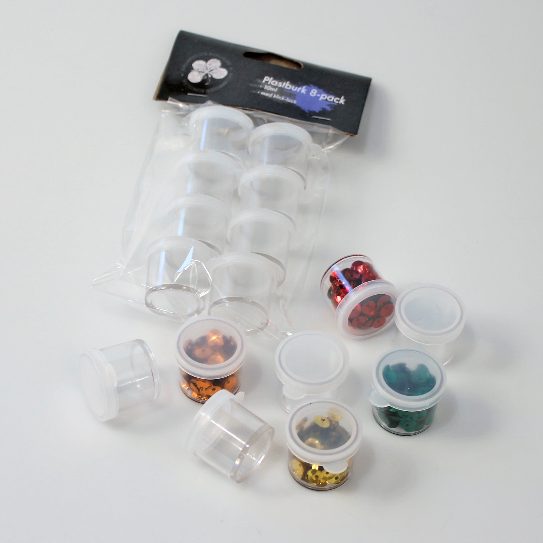 8 st plastburkar med klick-lock för förvaring av t.ex. insamlade fröer.